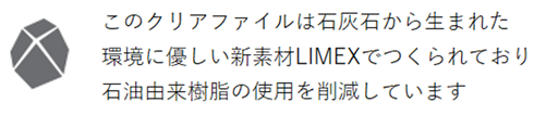 | 詳細 | 最も一般的なクリアファイルの大きさです。クリアファイル製作の9割以上がA4サイズのクリアファイルです。 書類の整理など非常に実用的で、いくつもらっても喜ばれるファイルです。 ライメックスとは石灰石と樹脂の組み合わせで製造された革命的新素材を使用したファイルです。 画像のようなライメックスマークを入れることが可能です。 |