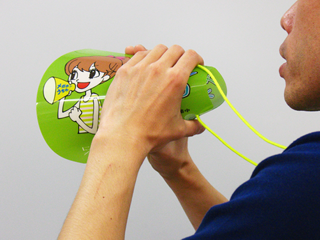 詳細 応援グッズの定番であるメガホンとうちわが一つになりました。 ぺったんこの時はうちわとして扇げ、持ち手を軽く押せば立体のメガホンになります。 使わない時は首から掛けておくことができます。
