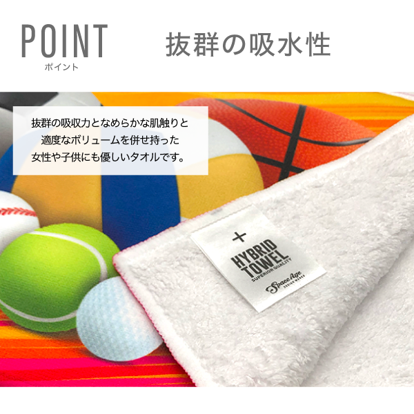 ハイブリッドタオルは「昇華転写プリント」という、転写紙にインクジェットプリントしたデザインを、タオルの生地の表面に合わせ、熱と圧力によりインクを定着させるプリント方法を採用し、写真画像でもいままでより遥かに鮮明に表現できるグラフィック性能を持ちます。